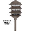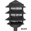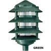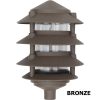 LED 120 Volt (standard) or 12 Volt (optional) Cast Aluminum 4-Tier Medium Base Pagoda Light. Made out of Heavy Duty Cast Aluminum (finished in the color of your choice, Black, Bronze or Green are standard) with a Clear Tempered Glass Jar Lens, this fixture carries a LIFETIME GUARANTEE against rust, and a 2 year overall warranty on the fixture. These LED lights are as bright as 15-50 watt incandescent lights yet consume at least 85% less power! Go green and save $$$. Go LED!
